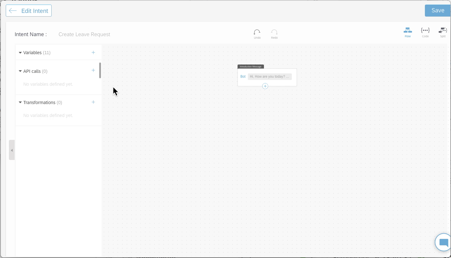 Since API's, transformations and variables are intent level activities, we added a panel on the left side of the dialog designer. This would allow developers to manage transformation functions, API settings, and local variables per intent.